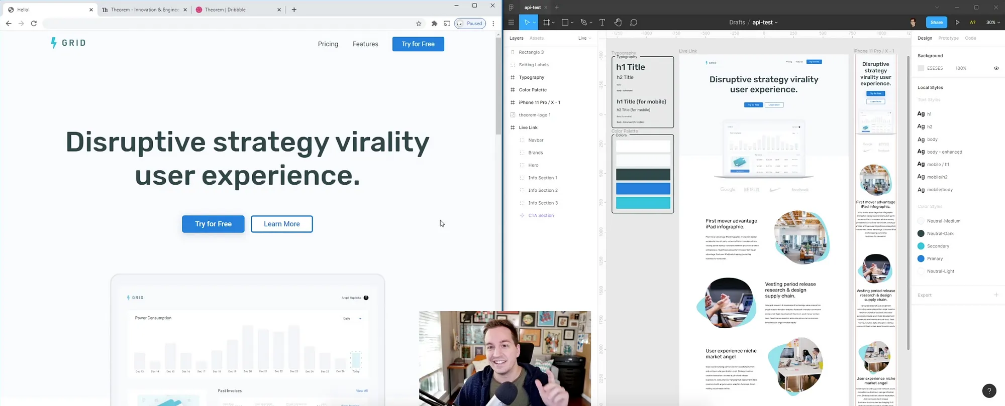 I finally had a chance to mess around with the newest version of the Figma API. I put together this little demo for internal-Theorem knowledge-sharing. Basically, I designed a quick landing page in Figma, coded out that design to a live page but synced up the styles, images, text, etc to the Figma document.
